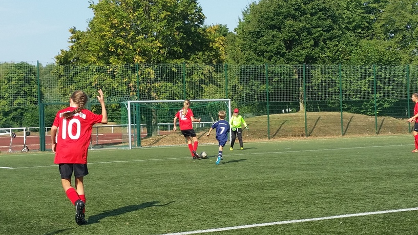 In den ersten Minuten war der Respekt gegen die 2 Köpfe größeren Mädchen sichtlich groß. Es dauerte eine Weile und ein paar gewonnenen Zweikämpfen, bis die Jungs merkten, da geht heute was. Im weiteren Verlauf hielten sich die TSG Kicker immer konsequenter an die Trainervorgaben und setzte sie perfekt um – den Gegner früh beim Spielaufbau stören, mutig in die Zweikämpfe gehen, den Ball kurz und flach durch die eigenen Reihen spielen. Das erste Tor ließ nicht lange auf sich warten. Der nach einer frühen Balleroberung gewonnene Eckestoß nutzte Bent, um den Ball aus kleinem Winkel für die 1:0 TSG-Führung reinzuzirkeln. Der Gegner ließ sich nicht vom Tor irritieren und versuchte das Spiel weg von der eigenen Hälfte zu verlagern – entweder ins Seitenaus oder ins Mittelfeld. So kam Nieder-Olm in dieser starken Phase für die TSG nach einem Einwurf etwas überraschend zum Ausgleich und zum 1:1 Halbzeitstand.