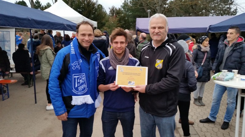 Aus den Händen des Beauftragten für soziales Engagement des Fußballkreises Mainz-Bingen, Volker Schmitt, nahm er die Urkunde im Rahmen der TSG Jugendweihnachtsfeier am vergangenen Sonntag entgegen. Die Gewinner/innen des Projektes „Fußballhelden – Aktion junges Ehrenamt“ werden im Jahr 2016 zur KOMM MIT-Bildungsreise nach Spanien an die Costa de Barcelona-Maresme eingeladen, wo sie in theoretischen und praktischen Workshops lernen, wie sie ihr Training zu Hause noch spannender und abwechslungsreicher gestalten können und weitere Einblicke in das Vereinsleben erhalten. Neben dem fachlichen Austausch mit den Referenten, dürfen sich die Teilnehmer auch auf rege Diskussionen und Finden gemeinsamer Lösungswege untereinander freuen.