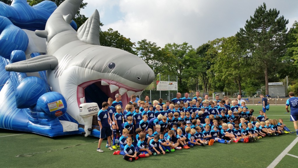 Von Montag bis Freitag von 9:00 bis 16:00 Uhr wurden die jungen Kicker auf der BSA von vielen engagierten Trainern, Betreuern und ehemaligen Campteilnehmern betreut und hatten viel Spaß bei Training, Bundesliga- und Weltmeister-Turnieren, Torwandschießen, DFB- und Mac Donalds-Fußballabzeichen und vielem mehr. Besonders schön war wieder der gemeinsame Grillabend mit über 200 Teilnehmern, großer Luftballonaktion und anschließender Zeltübernachtung. Doch der Clou, das HAI-Light, war der 8 – 10 Meter hohe aufblasbare Hai, der einen Tag zum Spielen, Toben und Rutschen zur Verfügung stand. Die Fußballabteilung bedankt sich bei allen Betreuern, Helfern und Sponsoren, die dazu beigetragen haben, das 5. Kinner-vun-de-Gass Feriencamp zu einem unvergesslichen Erlebnis zu machen.